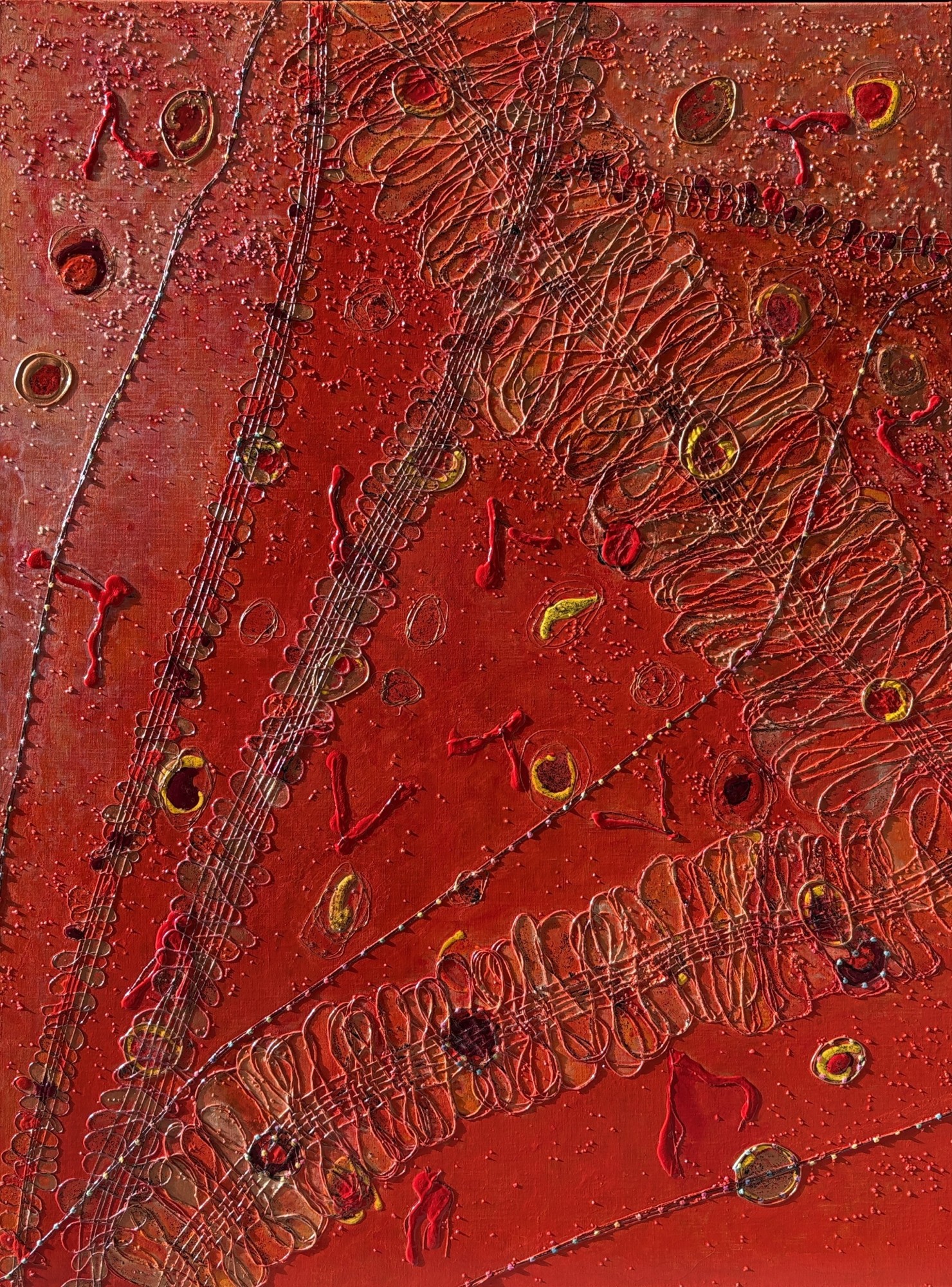 My paintings have a loose weave incorporated to enhance mood, feeling and texture. Weave and yarn have a tactile and flowing quality, suggesting flux, and movement. The yarns, loosely woven on my loom, include silks, linens and synthetics.