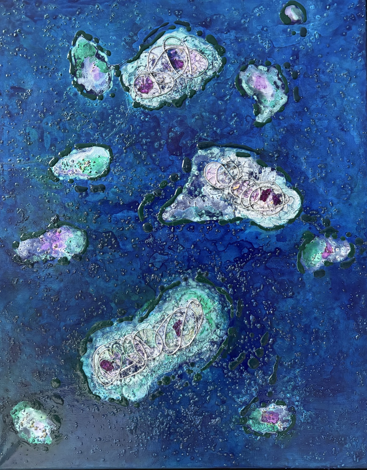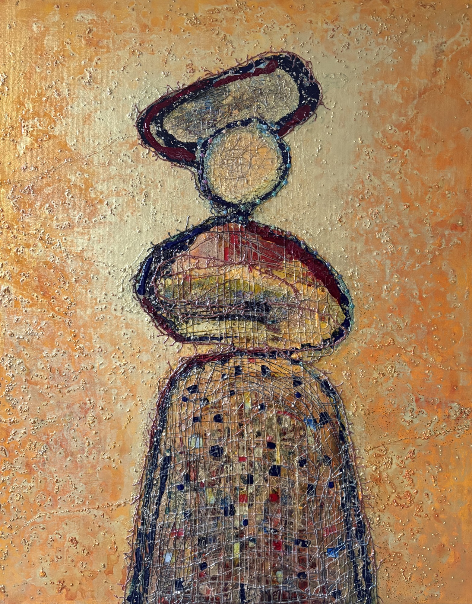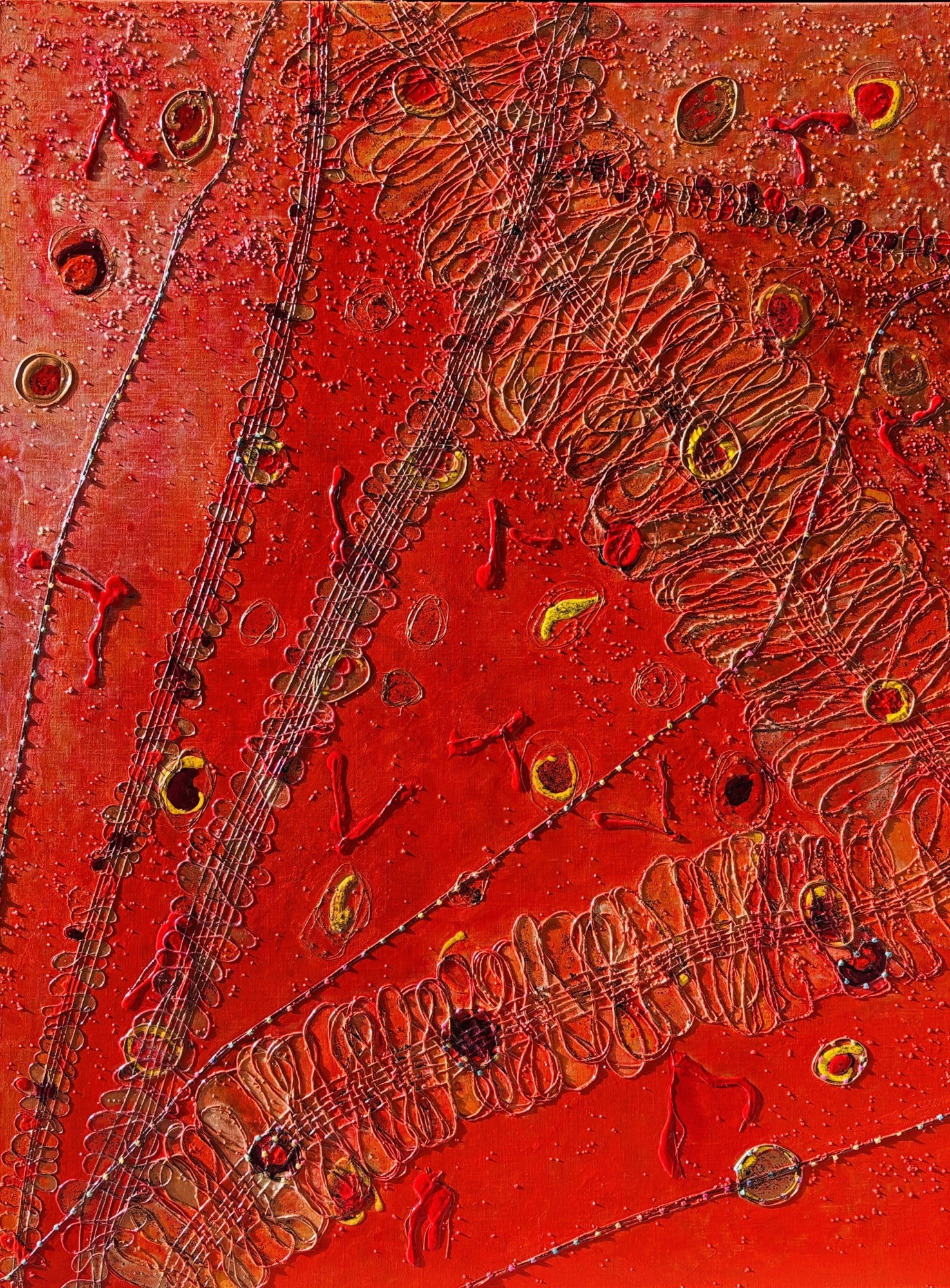 My paintings have a loose weave incorporated to enhance mood, feeling and texture. Weave and yarn have a tactile and flowing quality, suggesting flux, and movement. The yarns, loosely woven on my loom, include silks, linens and synthetics.